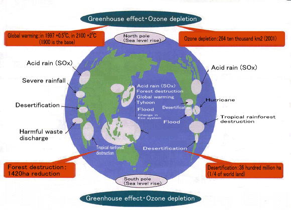 §3.Cause and conditionThe Earth temperature is determined by the balance between in and out energy. Current temperature increase is mainly due to lose the balance by increase of CO2.CO2 is discharged by igniting fossil fuels and has characteristic that absorb the heat from the earth, so that it is called greenhouse effect gas. There are other gasses which have same effects, such as methane, flon, and nitrous oxide. After 1980, average temperature in the earth has rapidly increased. There are several phenomenon such as heat wave and drought occurred due to global warming. Because of increase the temperature of ocean water, the level of ocean rose up. As a result salt water goes into underground water and rivers. The decrease of rain water causes desertification so that the agriculture is destroyed in the world. Global warming causes the lack of food in the world seriously. he factors of destroying ozone layer are artificial chemical substances such as flon and halon which had been used in refrigerator and sprays. When these matters rise up, chlorine atoms are produced by reaction with strong ultraviolet rays. Chlorine atoms take oxygen atoms from ozone, and a ten thousand ozone are destroyed by the one atom. Ozone exists at a height of 20 km and makes ozone layer. Ozone absorbs ultraviolet rays from the Sun. Ultraviolet rays causes skin cancer, cataract, and genetic defect. Ozone layer which absorbs ultraviolet rays has been destroyed. The factor of deforestation is the uncontrolled use of the area to industrial tree felling and agriculture. Igniting fossil fuels produces nitrogen oxide and sulphur oxide and these substances are changed nitrate ion and sulphate ion which leads acid rain. Acid rain destroys forests. Deforestation causes not only the extermination of living things but also decrease CO2 absorption, thus speeding up global warming. Tropical forest destruction also speed up. If it lasts this situation, it reports that all tropical forests will be destructed by 2030. In the mid of 1980, there are 19 hundred million ha tropical forest. In every year, 1420 ten thousands ha are cut and changed to agricultural fields every year. Forestation is only 1 hundred thousands, and it is just 1/10 of decrease area. The factors of desertification are excessive farming, overgrazing, and overcutting. On the background, there is population growth. To obtain enough food resource, lands are used endlessly thus desertification occurred. That causes more lack of food so that leads negative cycle. Every year, 600 ha desertify. There are also 21 million ha agricultural area decreases its productive ability. The agricultural productive ability decreases in the area where desertification progresses. Thus, there is serious issue of starvation and lack of nutrient.