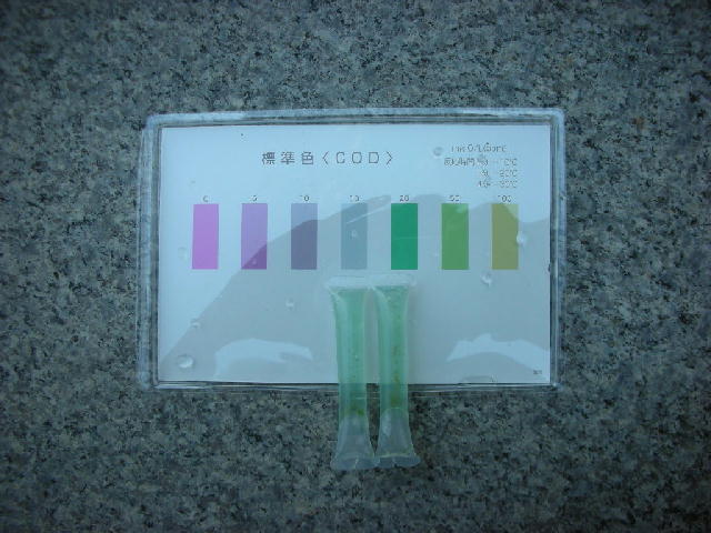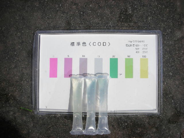 水中に素手を入れると痒くなるような、かなりの汚染度に炭素繊維にての水質浄化が可能かどうかは心配ですが様子を見ることにしました。 2008年10月7日 炭素繊維設置後の状況観察設置後2ヶ月の水質浄化効果の観察を、目視及び水質測定にて行いました。 ●水質測定項目 ・透視度、・COD、・PH、・硝酸(窒素)