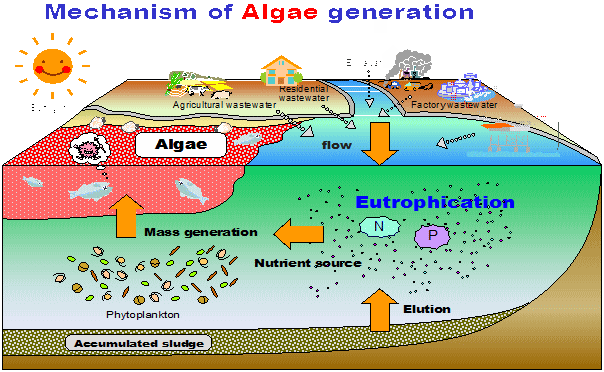 Growth mechanism of red tide Phytoplanktons which are the cause of red tide grow by nutrient salt in the ocean similar to land plants which obtain nutrient from soils. In nutrient enrichment condition, because phytoplankton increased by absorbing rich nutrient salts, it grows rapidly. Moreover, due to increase ocean temperature or other factors such as change of ecosystem balance, red tide emerges. Damage by red tide Due to red tide, large amount of oxygen are used. Because of lack of DO in the water, fishes die lack of air. Moreover, there are plankton which have poison, fishes also die by the poison, as well as that affects on land organisms and human which eat these fish. Therefore, red tide causes serious problems such as decrease of fish industry. Red tide type and organisms which causes red tide