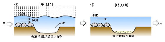 河川の浄化作用により、酸化、吸収、吸着された物質は固形化し、流速によって剥離あるいは沈殿汚泥として河床に堆積します。この堆積した汚泥は、出水時に流速が非常に速くなると掃流され、河川の浄化機能が回復します。