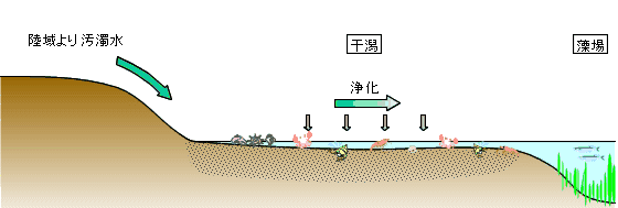 干潟再生技術 干潟は、海と陸の間にあって、生態系の食物連鎖、栄養塩類・物質循環の要として、生物生息機能、水域浄化機能、生物生産機能、生物の食物・栄養の受け渡し場所となっており、生態系の維持・継続に深く関わり、その状態の善し悪しは水質にも深く関係します。